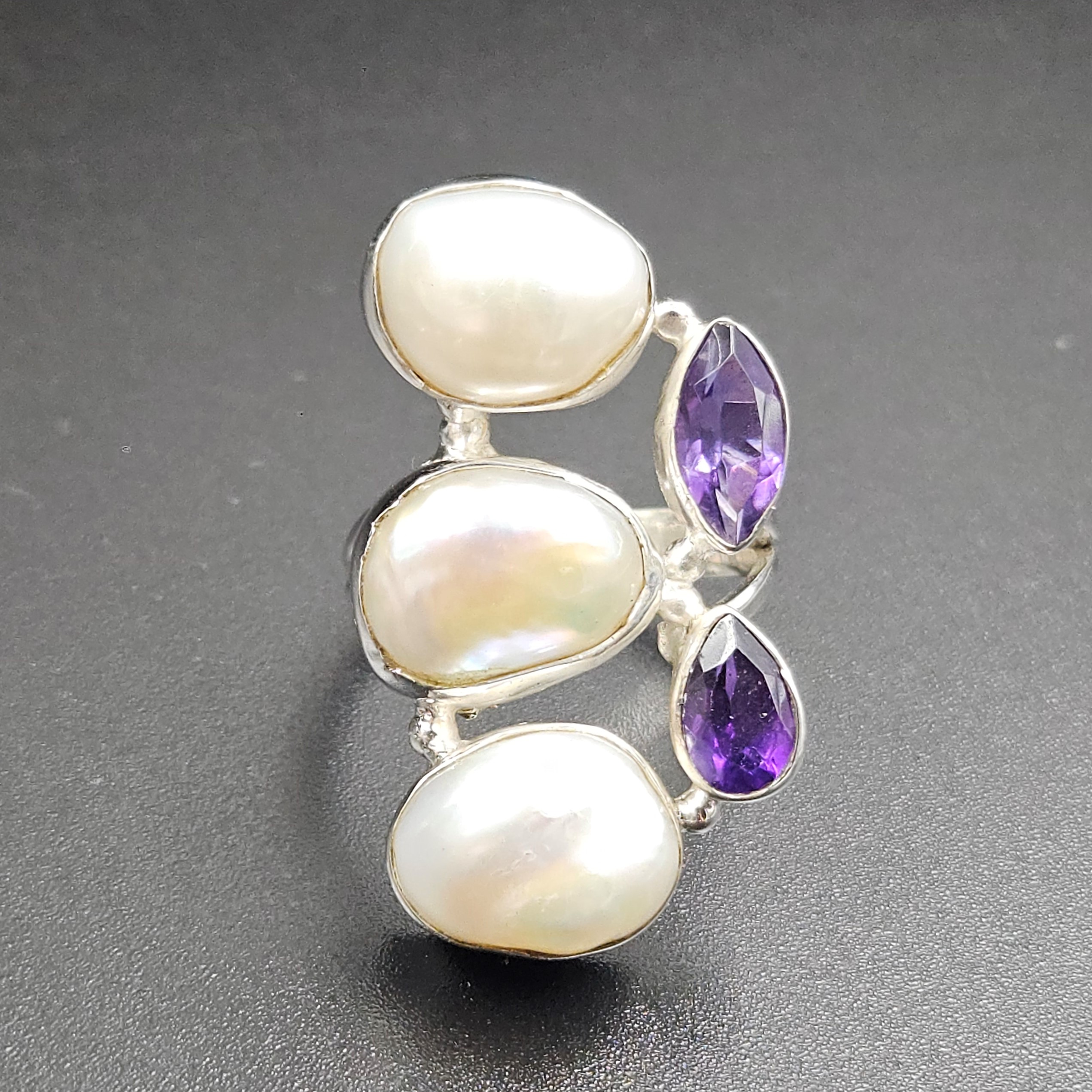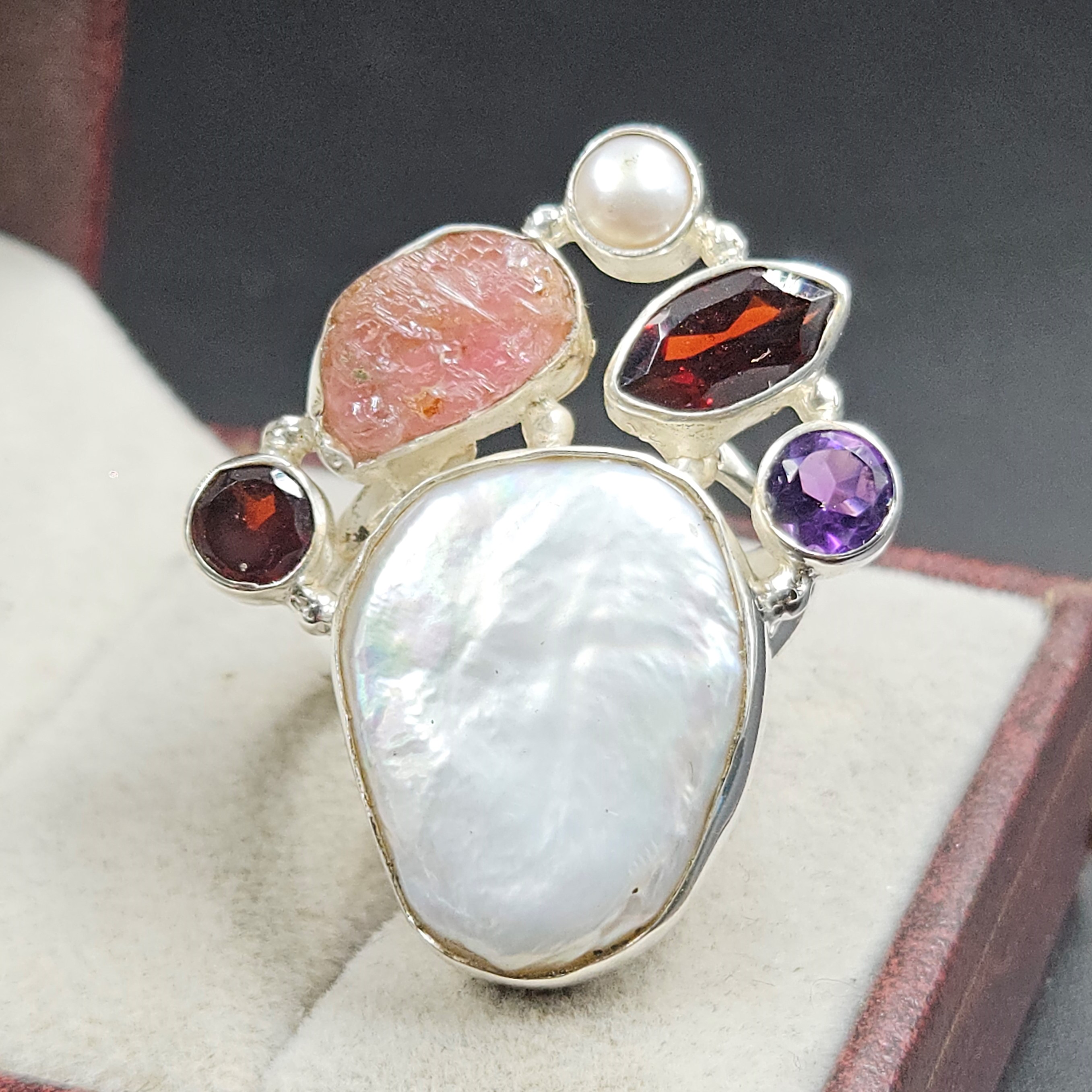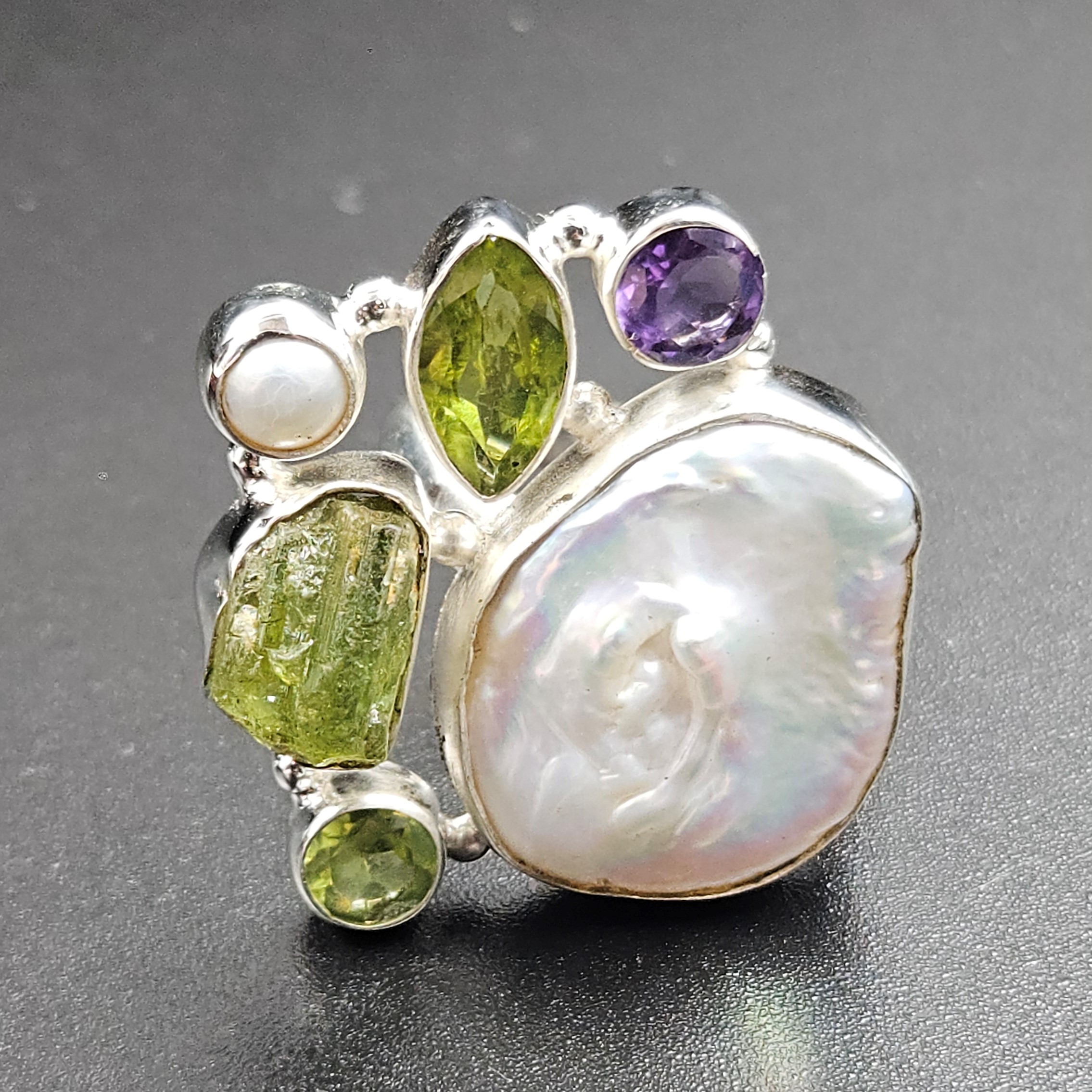 Baroque Pearl and Multi Gemstone Size US 8 925 Sterling Silver Ring (RS58-104)